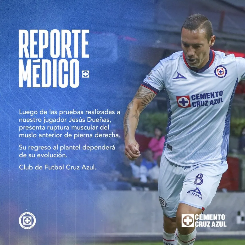 “Luego de las pruebas realizadas a nuestro jugador Jesús Dueñas, presenta ruptura muscular del muslo anterior de pierna derecha. Su regreso al plantel dependerá de su evolución”, fue el comunicado que emitió Cruz Azul este sábado.