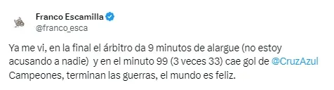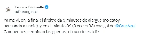“Ya me vi, en la final el árbitro da 9 minutos de alargue (no estoy acusando a nadie) y en el minuto 99 (3 veces 33) cae gol de Cruz Azul Campeones, terminan las guerras, el mundo es feliz”, publicó Escamilla.