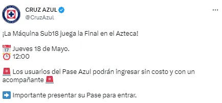 Y es que, para mala fortuna, no habrá venta de boletos para el partido de la Final de Ida, en el que Cruz Azul enfrentará a los Rayados, en el Estadio Azteca, pues el ingreso será un beneficio exclusivo para los aficionados que cuenten con su Pase Azul.