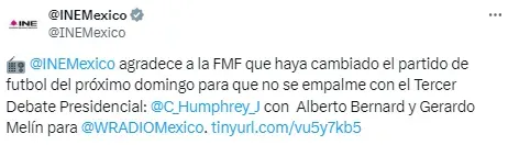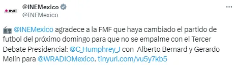 El motivo apunta a la tercera edición y última del debate presidencial, el cual tendrá lugar el mismo domingo 19 de mayo, a las 20:00 horas tiempo del centro de México. De esta manera, con el cambio de horario no se empalmarán las transmisiones.