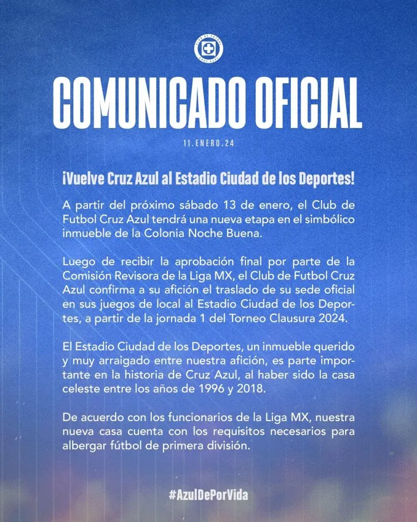 Cruz Azul por fin confirmó lo que ya era un secreto a voces desde hace tiempo: el regreso al Estadio Azul. Fue a través de un comunicado de prensa, publicado en sus redes sociales, donde el equipo cementero anunció con bombo y platillo la vuelta al ahora llamado Estadio Ciudad de los Deportes.