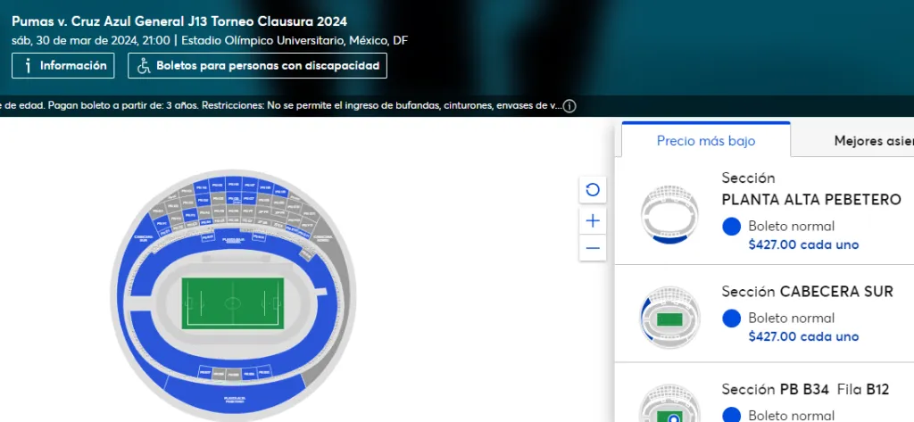 Y es que, de acuerdo con la información mostrada por Ticketmaster, toda la zona para la afición visitante, en la cabecera sur, ya no aparecía disponible. De esta manera, solo los boletos más caros son los que todavía quedaban a la venta para el Estadio Olímpico Universitario.