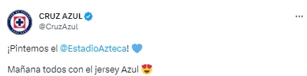 Es así que el gran deseo de Cruz Azul es pintar el Estadio Azteca de color azul, por lo que le pidió a sus aficionados que asistan al Coloso de Santa Úrsula con la camiseta de este color, que es la más tradicional del equipo celeste. “¡Pintemos el Estadio Azteca! Mañana todos con el jersey Azul“, publicó este viernes el club en sus redes.