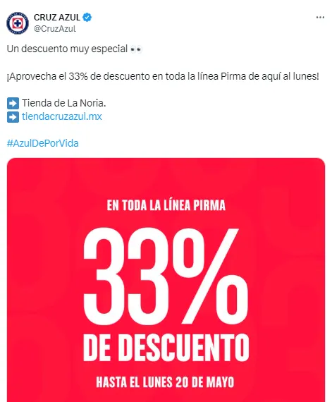 Cruz Azul lanzó una promoción en las camisetas de Pirma y toda la línea de productos de la firma mexicana con descuento del 33%. La oferta estará disponible hasta el lunes 20 de mayo, a través de la tienda en línea y la física ubicada en La Noria.