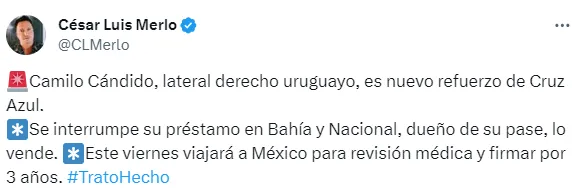 “Camilo Cándido, lateral derecho uruguayo, es nuevo refuerzo de Cruz Azul. Se interrumpe su préstamo en Bahía y Nacional, dueño de su pase, lo vende. Este viernes viajará a México para revisión médica y firmar por 3 años. Trato hecho”, publicó el reconocido periodista en su cuenta de Twitter.