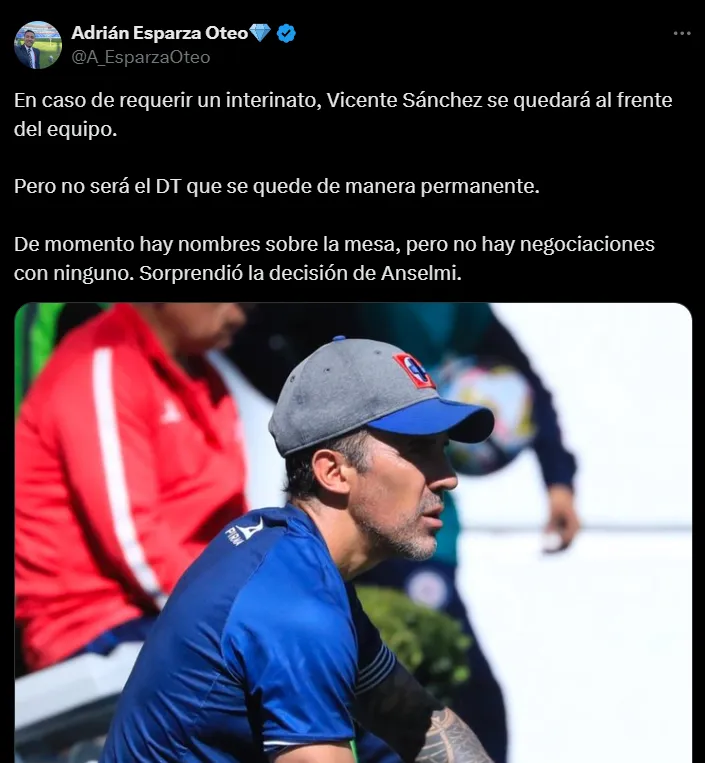 Fue Adrián Esparza, periodista de TUDN, quien dio a conocer dicha información, asegurando que Vicente Sánchez no se quedaría de manera fija en el banquillo cementero. Incluso, confirmó que ya habría algunos nombres como posibles candidatos en La Noria, aunque todavía ninguno cercano a llegar.