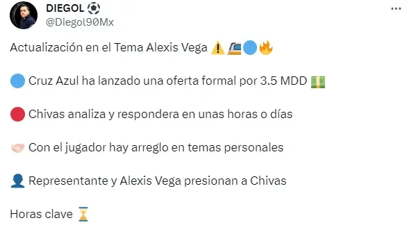 “Cruz Azul ha lanzado una oferta formal por 3.5 MDD. Chivas analiza y responderá en unas horas o día. Con el jugador hay arreglo en temas personales. Representante y Alexis Vega presionan a Chivas. Horas clave”, dio a conocer el periodista Diego Sánchez, de Onefootball.