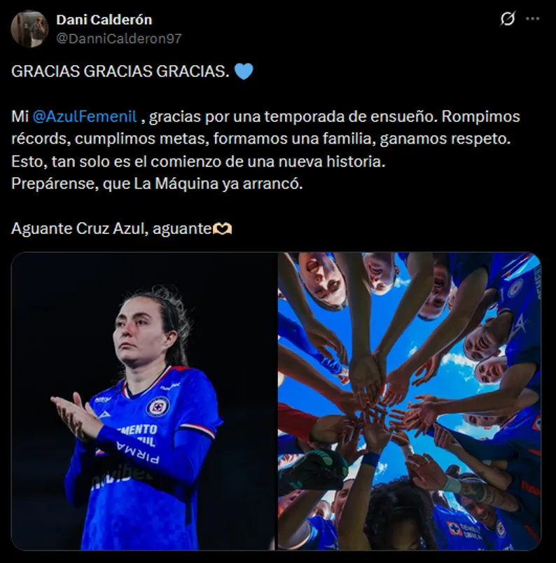 “GRACIAS GRACIAS GRACIAS. Mi Cruz Azul femenil ,gracias por una temporada de ensueño. Rompimos récords, cumplimos metas, formamos una familia, ganamos respeto. Esto, tan solo es el comienzo de una nueva historia. Prepárense, que La Máquina ya arrancó. Aguante Cruz Azul, aguante“, expresó.