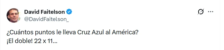 En su cuenta de X (antes Twitter), el periodista publicó: “¿Cuántos puntos le lleva Cruz Azul al América? ¡El doble! 22 x 11…”, destacando de forma irónica la brecha entre ambos equipos. Un posteo refleja la atención mediática que genera Cruz Azul en la actualidad.