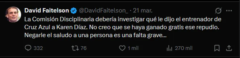 David Faitelson, analista de TUDN, encendió la mecha al calificar el gesto de la colegiada como una “falta grave” contra el profesionalismo. El comunicador utilizó sus plataformas digitales para exigir que la Comisión Disciplinaria inicie una investigación formal, argumentando que el respeto debe ser mutuo en el terreno de juego.