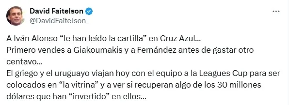 Está claro que generó desconcierto esta decisión debido a que venían entrenando separados al resto de la plantilla. En medio de este contexto, David Faitelson apuntó contra el director deportivo de la institución: “A Iván Alonso ‘le han leído la cartilla’ en Cruz Azul… Primero vendes a Giakoumakis y a Fernández antes de gastar otro centavo… El griego y el uruguayo viajan hoy con el equipo a la Leagues Cup para ser colocados en “la vitrina” y a ver si recuperan algo de los 30 millones dólares que han “invertido” en ellos…”.