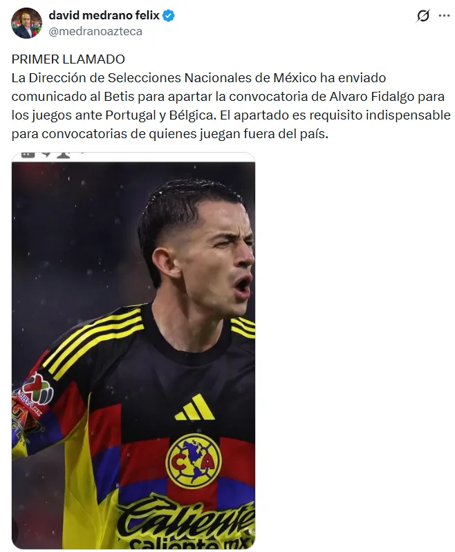 Según Medrano, “la Dirección de Selecciones Nacionales de México ha enviado comunicado al Betis para apartar la convocatoria de Álvaro Fidalgo para los juegos ante Portugal y Bélgica. El apartado es requisito indispensable para convocatorias de quienes juegan fuera del país”.