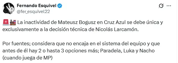Según el reportero Fernando Esquivel, de 365 Sports, la inactividad de Bogusz se debería “única y exclusivamente a la decisión técnica de Nicolás Larcamón. Considera que no encaja en el sistema del equipo y que antes de él hay dos o hasta tres opciones más: Paradela, Luka y Nacho Rivero (cuando juega de mediapunta)”.