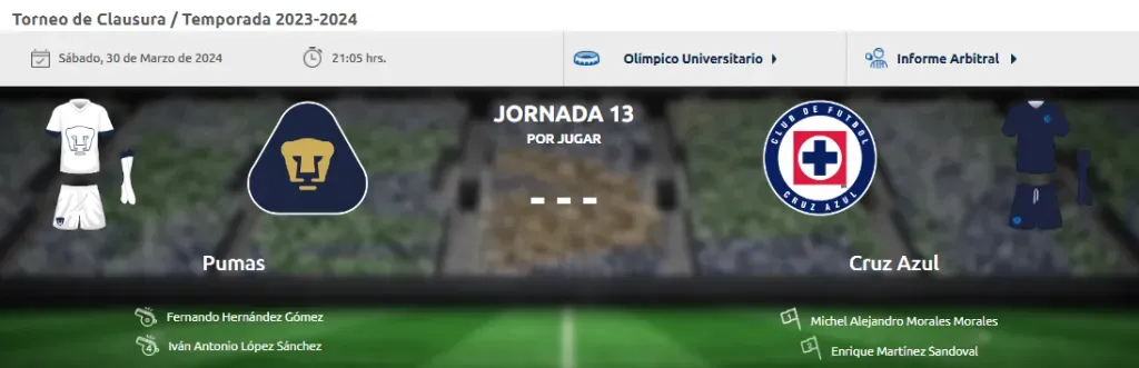 Asimismo, también en la información dada a conocer por la Liga MX quedaron revelados los nombres de los árbitros encargados de impartir justicia en Ciudad Universitaria en la Jornada 13, en el partido más esperado de esta fecha. Será Fernando Hernández el silbante central.