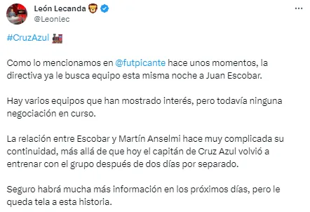 “Tras la reunión que sostuvieron este miércoles por la tarde en La Noria el defensa paraguayo, Anselmi y el director deportivo Iván Alonso, se tomó la decisión de que la salida de Escobar es la mejor alternativa al conflicto, más allá de las disculpas entre ambas partes y los mensajes que el propio jugador subió a sus redes sociales tratando de calmar las aguas y confiando en su continuidad en Cruz Azul, los cuales borró más tarde”, publicó el periodista en ESPN.