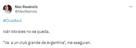 Además, el analista dio a conocer que el futuro de Iván Morales podría estar en el futbol de Argentina, donde podría tener otra oportunidad a sus 24 años de edad; versión que fue reforzada por la periodista de ESPN, Mac Reséndiz, quien adelantó que podría ir a un equipo grande del país Campeón del mundo.