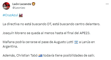 “La directiva no está buscando DT, está buscando centro delantero. Joaquín Moreno se queda al menos hasta el final del APE23“, informó el periodista a través de su cuenta de Twitter.