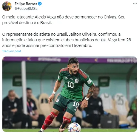 “Es poco probable que el mediocampista ofensivo Alexis Vega permanezca en Chivas. Su probable destino es Brasil. El representante del deportista en Brasil, Jailton Oliveira, confirmó la información y dijo que hay clubes brasileños interesados. Vega tiene 26 años y puede firmar un precontrato en diciembre”, se lee en el Twitter del reportero brasileño.