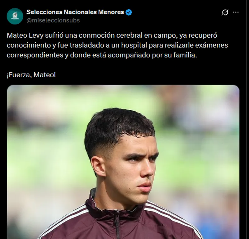 Si bien se presumía el tipo de lesión que padece, fue la Selección Mexicana de la categoría quien aclaró aún más las cosas: “Mateo Levy sufrió una conmoción cerebral en campo, ya recuperó conocimiento y fue trasladado a un hospital para realizarle exámenes correspondientes y donde está acompañado por su familia“.