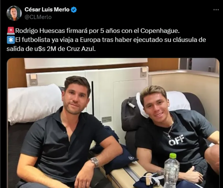 Por otro lado, el periodista argentino César Luis Merlo expresó en sus canales oficiales que Huescas firmará un vínculo hasta 2028 con el cuadro danés. En la foto se lo puede observar con Santiago Arbide, su agente que influyó bastante en la determinación de marcharse de Cruz Azul, pese a que aún bastaban algunas cosas por resolverse.