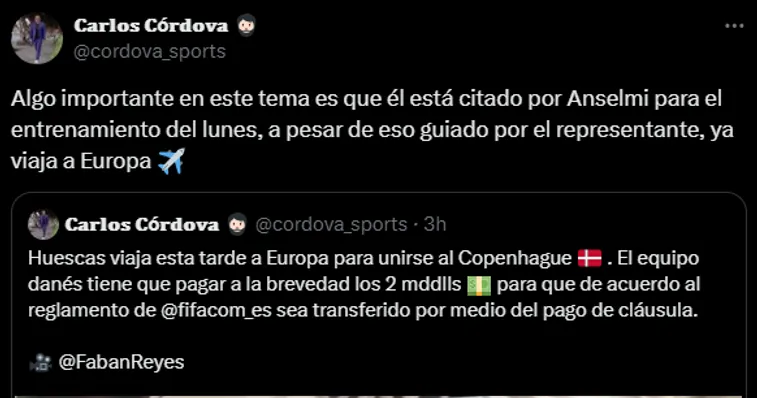 Primero el periodista dejó en claro que Copenhague todavía no pagó los 2 millones de su cláusula de rescisión, y todavía no hay mayores novedades de ello. Luego, el plato fuerte: “Algo importante en este tema es que él (Huescas) está citado por Anselmi para el entrenamiento del lunes, a pesar de eso guiado por el representante, ya viaja a Europa“, expresó.