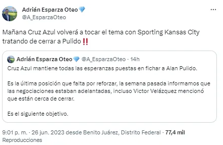 “Mañana (hoy) Cruz Azul volverá a tocar el tema con Sporting Kansas City tratando de cerrar a Pulido. Cruz Azul mantiene todas las esperanzas puestas en fichar a Alan Pulido“, insistió el reconocido periodista acerca del posible fichaje en La Noria.