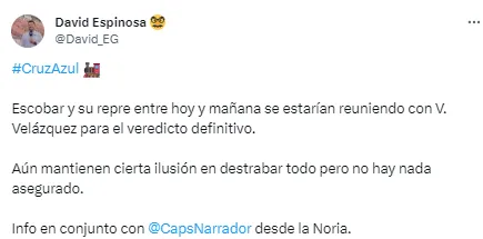 “¿Y si de esto sale algo positivo? Lo menciono por lo que dijo Escobar ayer (no aseguró que se va) y también quedó claro que no sobran jugadores como él en el plantel, y que además la afición lo quiere muchísimo. Juan, Martín, Iván, Sr. Velázquez, analicen bien la situación, porfa y aprovechemos esta primera jornada para hacer la paces y empezar a escribir una linda historia“, sentenció.
