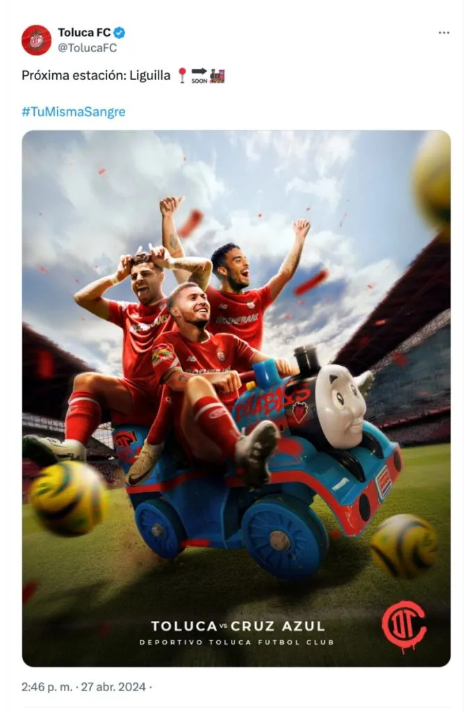 Bajo ese escenario, la entidad escarlata encendió el partido con una polémica imagen en redes sociales. Y es que los Diablos Rojos publicaron una gráfica en la que aparecen tres de sus jugadores sobre una locomotora, agregando la frase: “Próxima estación: Liguilla”.