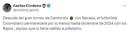 “Después del gran torneo de Cambindo con Necaxa, el futbolista colombiano permanecerá por lo menos hasta diciembre de 2024 con los Rayos, equipo que lo tiene cedido a préstamo”, informó el también ex director de comunicación del equipo cementero.