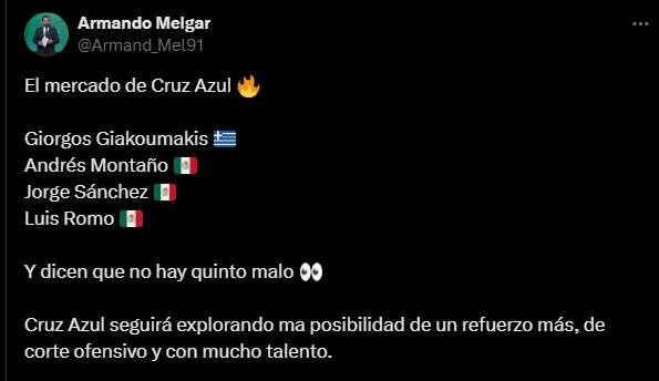 El cronista Armando Melgar escribió en su cuenta de X algo que pocos esperaban: “Cruz Azul seguirá explorando la posibilidad de un refuerzo más, de corte ofensivo y con mucho talento“. Sin divulgar su nombre, de este modo se deja en claro que, probablemente, haya al menos una cara nueva más en La Noria.