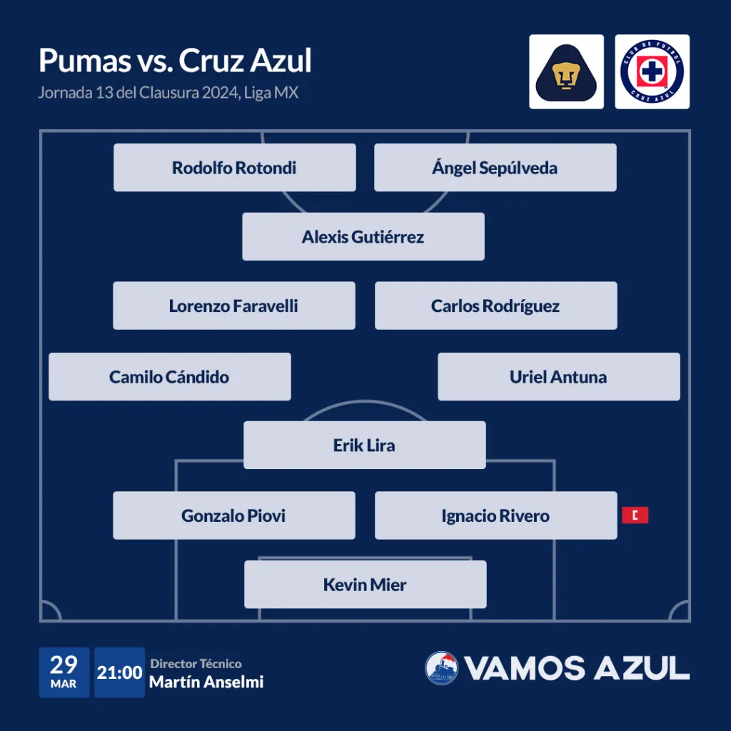 Y es que, frente a las Águilas sumó a un elemento en la mediacancha con la incorporación de Alexis Gutiérrez, quien volvería acompañar a Lorenzo Faravelli y Carlos Rodríguez, a su regreso del Tri. En el ataque podrían repetir Rodolfo Rotondi y Ángel Sepúlveda.