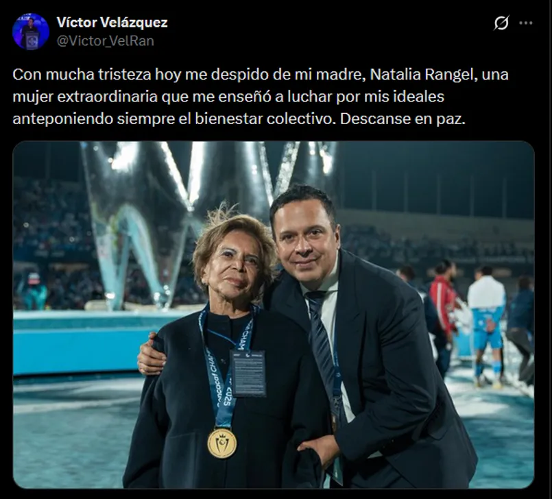 El entorno de Cruz Azul se encuentra de luto tras la confirmación del sensible fallecimiento de Natalia Rangel Rodríguez, madre del presidente de la institución, Víctor Velázquez. El propio directivo dio a conocer la noticia a través de sus plataformas digitales, compartiendo un mensaje cargado de emotividad sobre el legado de valores que recibió de ella.