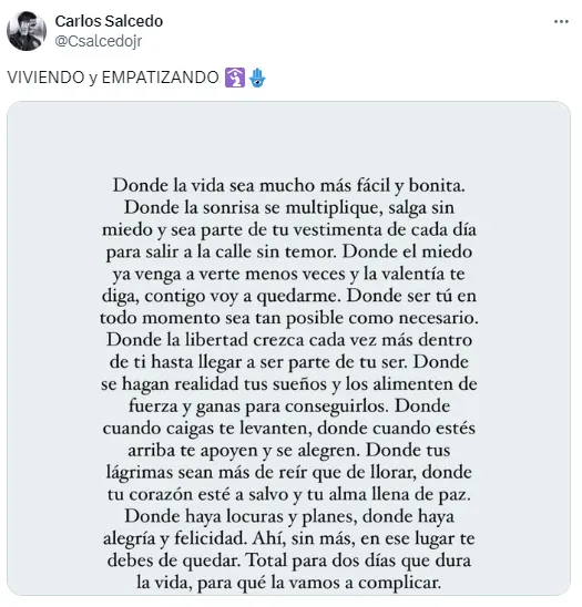 “Donde haya locuras y planes, donde haya alegría y felicidad. Ahí, sin más, en ese lugar te debes quedar. Total para dos días que dura la vida, para qué la vamos a complicar”, fue el cierre del texto publicado por el Titán y en el que la afición celeste le pidió que se quedara en el club.