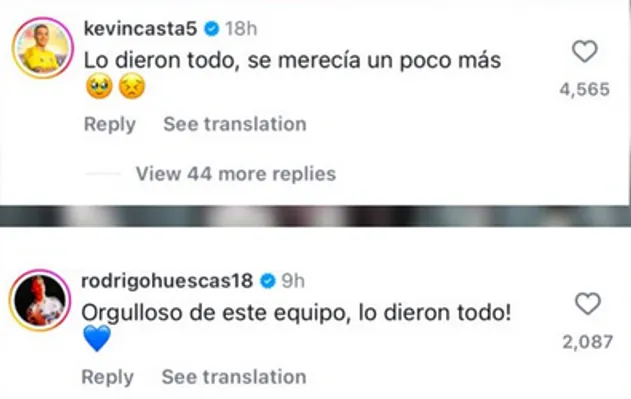 Como no podía faltar, Santiago Giménez mostró su apoyo simplemente poniendo un corazón celeste. También hizo lo propio otro canterano como Rodrigo Huescas, el cual expresó: “Orgulloso de este equipo, lo dieron todo!”. Para cerrar, llamativamente también apareció Kevin Castaño: “Lo dieron todo, se merecían un poco más”.