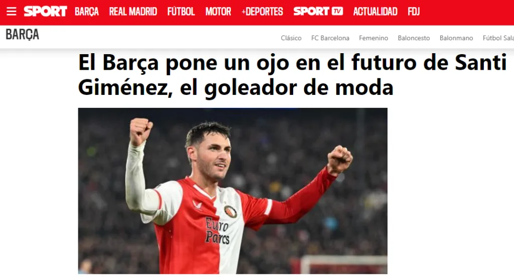 “El club blaugrana sí que está atento a todo lo que se mueve en el mercado y uno de esos jugadores de los que se tienen buenos informes es Santiago Giménez, goleador del Feyeenord que está batiendo todo tipo de registros en Holanda”, se pudo leer en la versión digital de dicho medio este martes a primera hora, destapando así el que sería el bombazo de cara al mercado invernal.