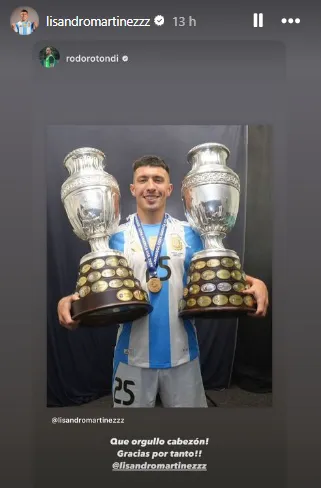 Así, la parcialidad albiceleste en La Máquina fue la que terminó festejando con el Bicampeonato de la Selección liderada por Lionel Messi. Incluso, el autor del último doblete cementero no dudó en felicitar a uno de sus amigos y pieza clave de un nuevo título para el Campeón del Mundo.