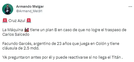 “La Máquina tiene un plan B en caso de que no logre el traspaso de Carlos Salcedo, Facundo Garcés, argentino de 23 años que juega en Colón“, apuntó el periodista a través de su cuenta de Twitter.