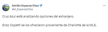De acuerdo con información del periodista de TUDN, Adrián Esparza, el equipo cementero todavía se encuentra analizando opciones en el mercado extranjero, por lo que una de ellas sería el exjugador de Racing, quien habría sido ofrecido desde Estados Unidos.