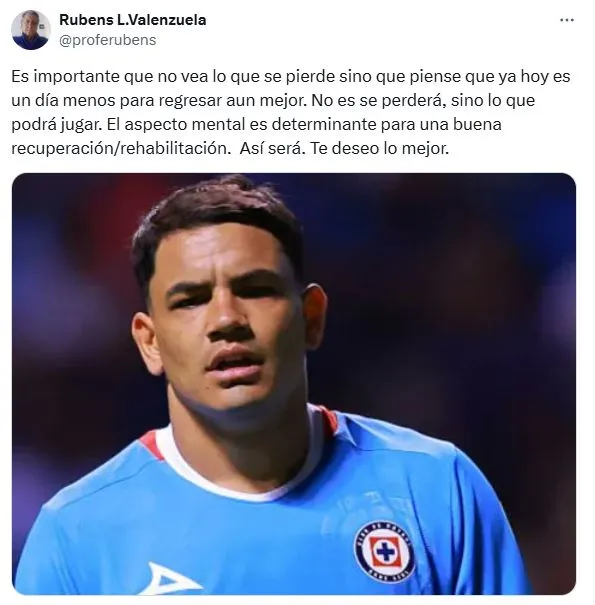 Ante este contexto, Rubens Valenzuela, preparador físico de La Máquina, le envió un mensaje motivador en redes sociales: “Es importante que no vea lo que se pierde sino que piense que ya hoy es un día menos para regresar aun mejor. No es lo que se perderá, sino lo que podrá jugar. El aspecto mental es determinante para una buena recuperación/rehabilitación. Así será. Te deseo lo mejor”.