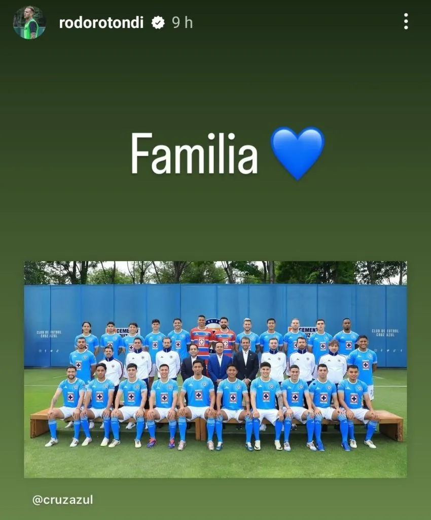 “Familia”, fue el breve, pero contundente mensaje que mandó Rodo Rotondi desde la intimidad de La Noria para dar muestra de lo que se vive en el vestidor de Cruz Azul y la unión, no solo de los jugadores, sino también con Martín Anselmi, su cuerpo técnico y hasta la directiva.