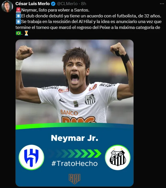 En caso de hacerse cargo del primer equipo del Peixe, el ex de Cruz Azul podría dirigir nada menos que a Neymar Jr. Y es que según informó el periodista César Luis Merlo, el club brasileño tendría todo acordado para que en el 2025 se de el regreso del habilidoso futbolista de 32 años, quien todavía pertenece a Al-Hilal.