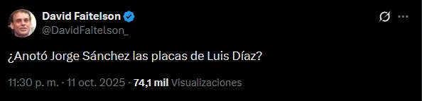 Más allá de que la afición pide su salida del Tri, el periodista David Faitelson lanzó una indirecta a través de sus redes sociales mientras veía el baile que le estaban dando al formado en América. “¿Anotó Jorge Sánchez las placas de Luis Díaz?”, expresó en relación a las veces que perdió en velocidad con el ex Liverpool.