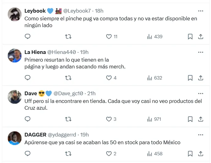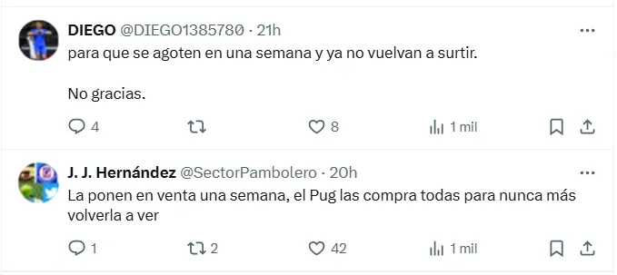 Varios de los seguidores azulinos expresaron opiniones negativas al respecto, focalizándose principalmente en torno a la falta de stock, un problema que viene trayendo dolores de cabeza a los fans cementeros. “Primero resurtan las que tienen en la página y luego andan sacando más merch”, comentó un aficionado. Un punto valido y que toma más relevancia al descubrir que a un día de su lanzamiento, esta playera ya está agotada en todos sus talles.