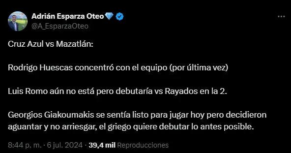 Fue el periodista Adrián Esparza quien confirmó su presencia en el Estadio Azul, a través de su cuenta personal de X. “Rodrigo Huescas concentró con el equipo por última vez“, sentenció. Además, destaca el intento del ex Atlanta United de querer jugar pese a su lesión en el tobillo: “Decidieron aguantar y no arriesgar, el griego quiere debutar lo antes posible“, cerró.