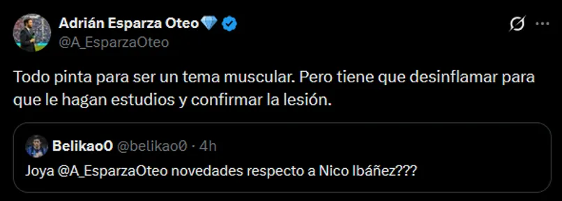 “Lo de Nico aparentemente sería una lesión muscular ahí en el gemelo, en la zona del chamorro como le dicen ustedes. Y bueno, a la espera de los estudios. No es nada ligamentario, nada de tendinoso, así que en ese sentido quédense tranquilos, porque sé que había trascendido de que era una lesión más grave de la que aparentemente sería”, expresó.