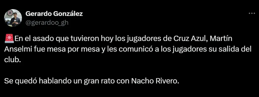 “Anselmi le explicó a la plantilla de Cruz Azul que es un sueño cumplido dirigir en Europa y pidió disculpas por irse y dejarlos con el torneo iniciado“, fueron los detalles que dio César Caballero, periodista de ESPN, acerca del último careo entre Anselmi y sus futbolistas.