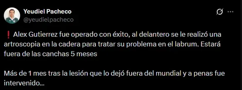 Así lo reveló el periodista Yeudiel Pacheco a través de X, contando además el tiempo que demorará en recuperarse. “Alex Gutierrez fue operado con éxito, al delantero se le realizó una artroscopia en la cadera para tratar su problema en el labrum. Estará fuera de las canchas 5 meses“.