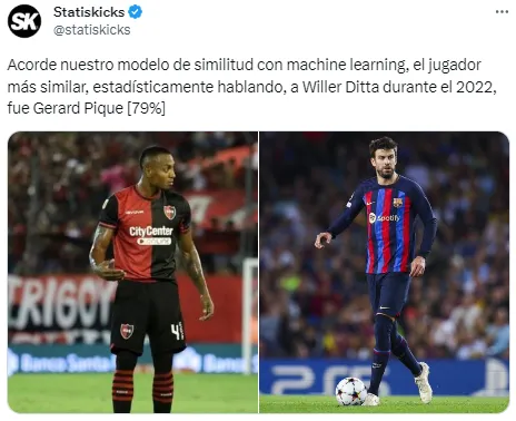 “Acorde nuestro modelo de similitud con machine learning, el jugador más similar, estadísticamente hablando, a Willer Ditta durante el 2022, fue Gerard Pique [79%,]”, reportó la famosa cuenta Statiskicks a través de su Twitter.