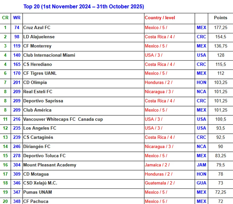 La Liga MX no quedó mal representada, pero fue La Máquina quien marcó la diferencia con una brecha notable respecto del resto. Monterrey, Tigres, América, Toluca, Pumas y Pachuca también figuraron en los primeros 350 lugares, aunque ninguno logró acercarse a la cosecha celeste. En números globales, el celeste se adueñó del sitio 74, con 177.25 puntos.
