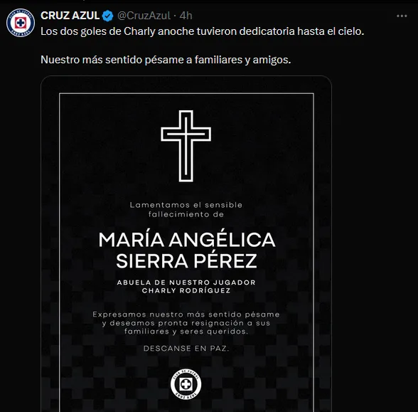 “Lamentamos el sensible fallecimiento de María Angélica Sierra Pérez, abuela de nuestro jugador Charly Rodríguez. Expresamos nuestro más sentido pésame y deseamos pronta resignación a sus familiares y seres queridos. Descanse en paz”, publicaron desde las redes del club celeste.